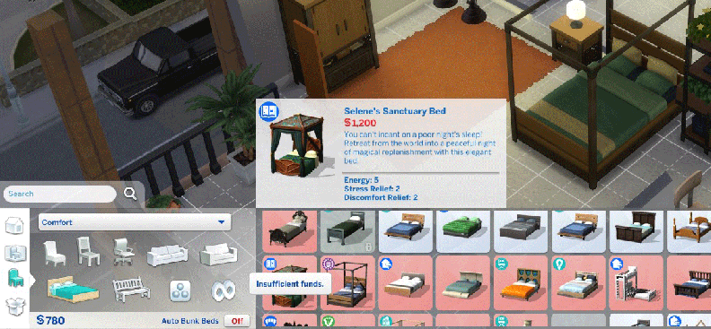 My one complaint would be that the stats of for the bed seem low compared to other similarly priced items. For §1200 the bed in the pack – although it looks awesome – only has an energy of 1, with no other stats. Compare that to the Selene bed from the Realm of Magic pack, which costs the same but has Energy of 5, Stress Relief of 2 and Discomfort Relief of 2. I know which one I’d rather put my sims in for a good night’s sleep!